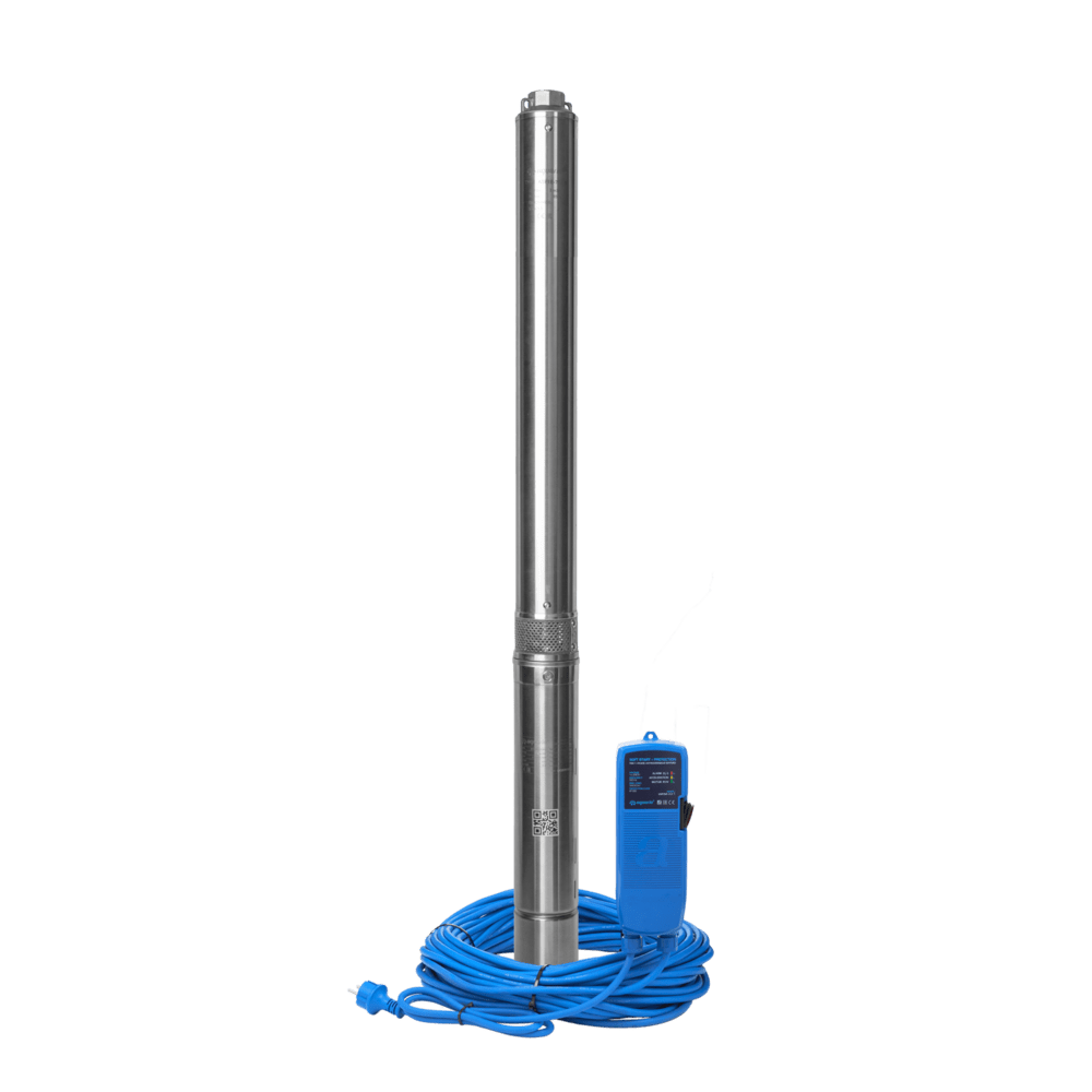 комплектация внешним защитным блоком с функцией плавного пуска, защиты от перегрузки двигателя, защиты от низкого и высокого напряжения в сети